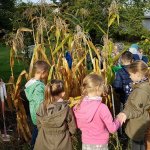 Wie bei der Pflanzung angekündigt durfte an diesem Tag der Mais verkostet werden. Doch zuvor ging es zum Maisbeet. Hier konnten die Kinder nochmals den reifen Mais betrachten und feststellen, dass fast alle Maiskolben den Vögeln zum Opfer gefallen waren und damit nur sehr wenig Mais aus der eigenen Pflanzung zur Verkostung übrigblieb.